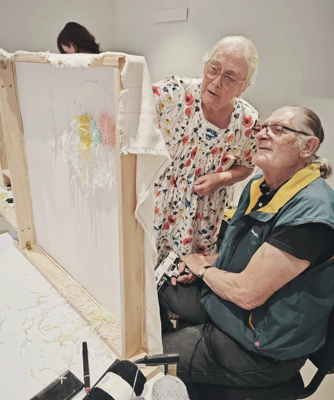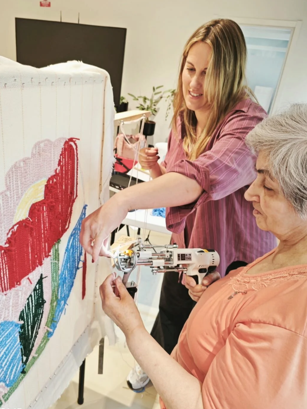 Med hjälp av tuftningspistolen skjuter man in garnet i ett finmaskigt nät som är uppspänt i en stor ram. Med olika tjocklekar och färger på garn kan man skapa en variation av texturer och effekter, som ofta ger ett kreativt och färgstarkt resultat!