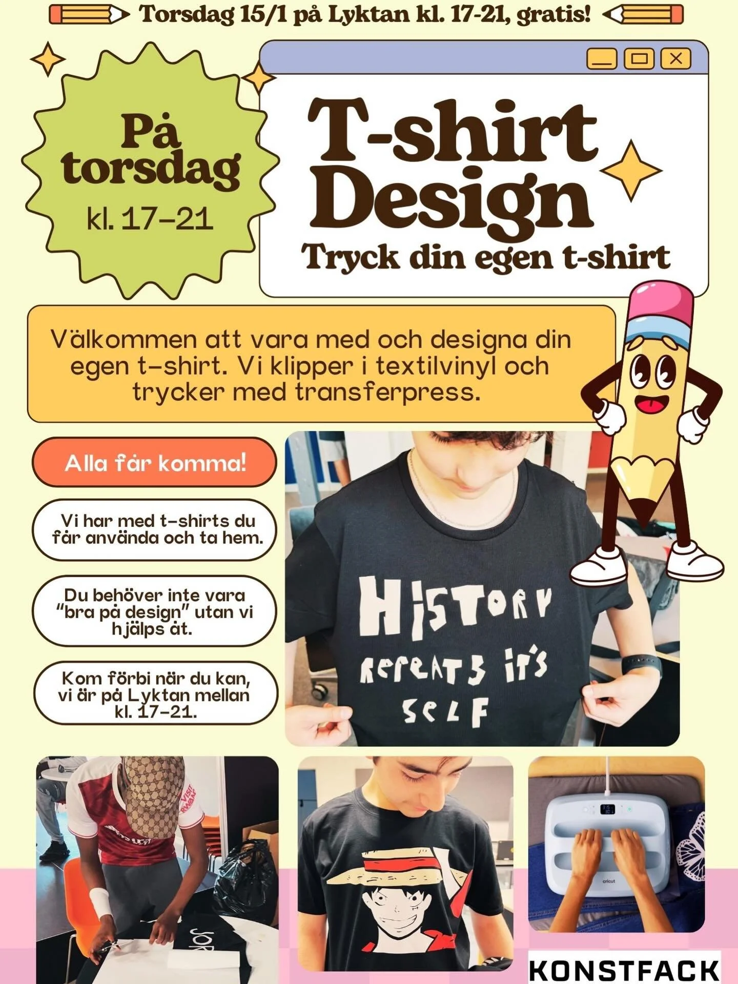 I den här workshopen skapar eleverna egna affischer utifrån ett tema som ni på skolan bestämmer. Workshopen kan göras analogt med penna, papper, fotografier, screentryck och collage.