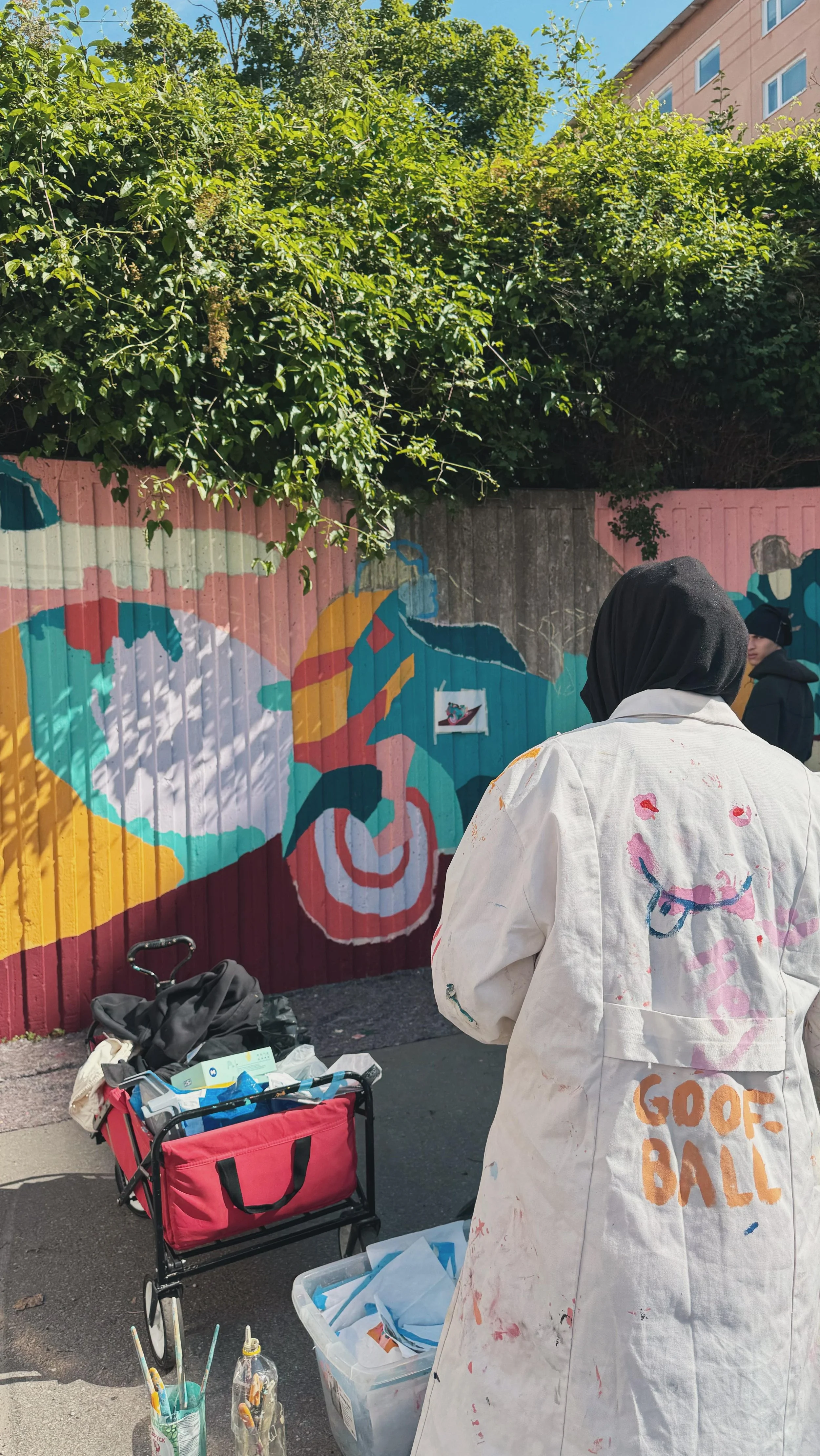 I den här workshopen skapar deltagarna bilderna till målningen i en app som heter Procreate eller med penna och papper, bilderna tejpas sedan upp på väggen och fälten fylls i med miljövänlig och väderbeständig färg. Det blir en målning som kan hålla i decennier.