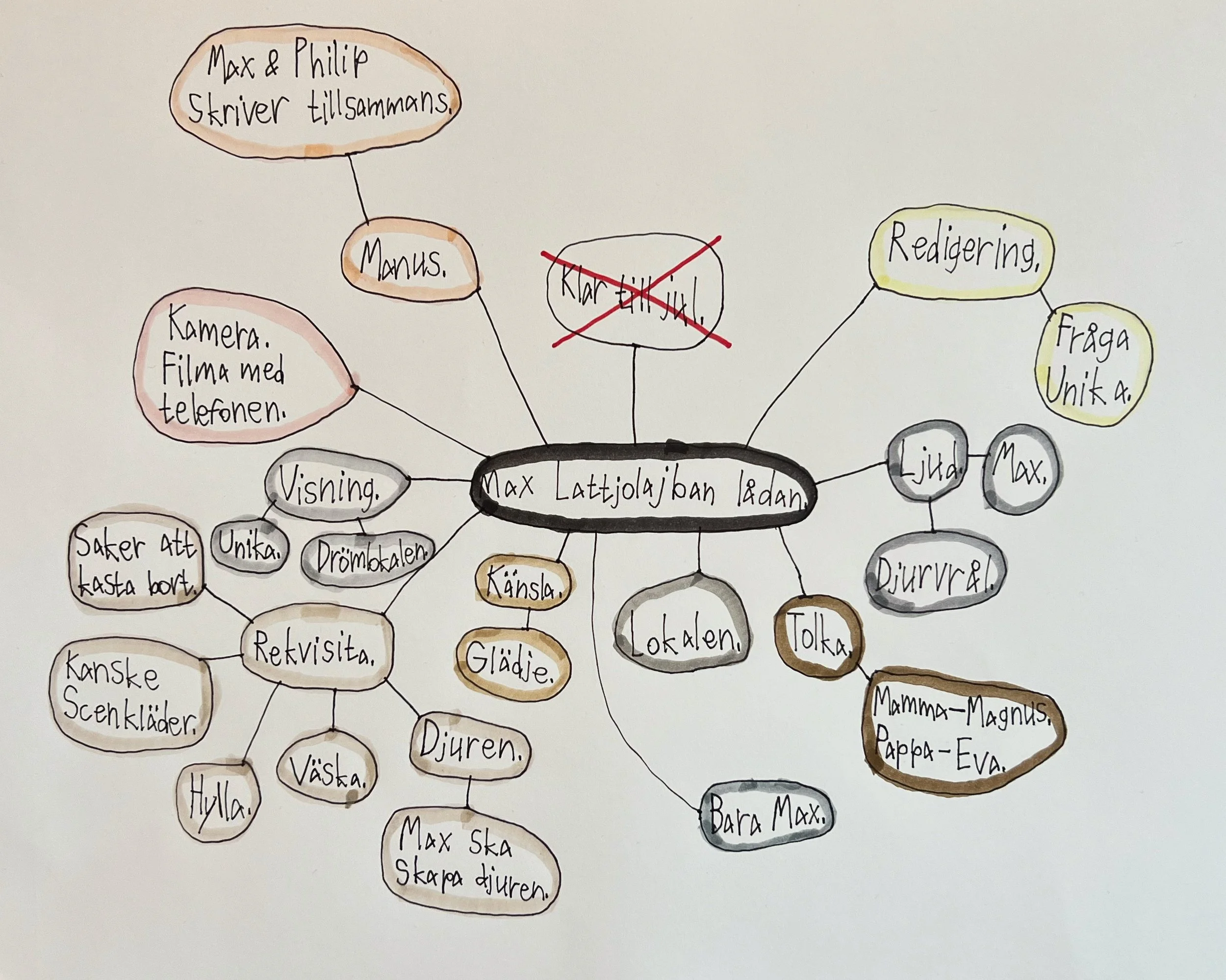Bilden här ovanför tycker vi illustrerar hur många delar ett filmprojekt består av. Genom att studera bilden kan vi som pedagoger få många ledtrådar till vad vi behöver förbereda våra deltagande barn på innan vi kör igång ett filmprojekt. Bilden är skapad av Max som har diagnosen Autism. En av hans drömmar är att jobba som filmregissör. Max har varit en stor del av detta projekt, han har bidragit med sina perspektiv på hur vi kan anpassa lärandet inom film för att fungera för alla barn. Max har lärt oss att det teoretiska måste hela tiden blandas med praktisk arbete och att man i förväg måste förbereda för nästa steg. Ett helt projekt kanske inte från början går att greppa utan istället tänka på att hela tiden bygga på med den kunskap som behövs inför nästa steg i arbetet med att göra filmen. Men alla är olika och lär sig på sitt viss, som pedagog måste vi vara öppna och nyfikna inför det och anpassa oss och vår undervisning.