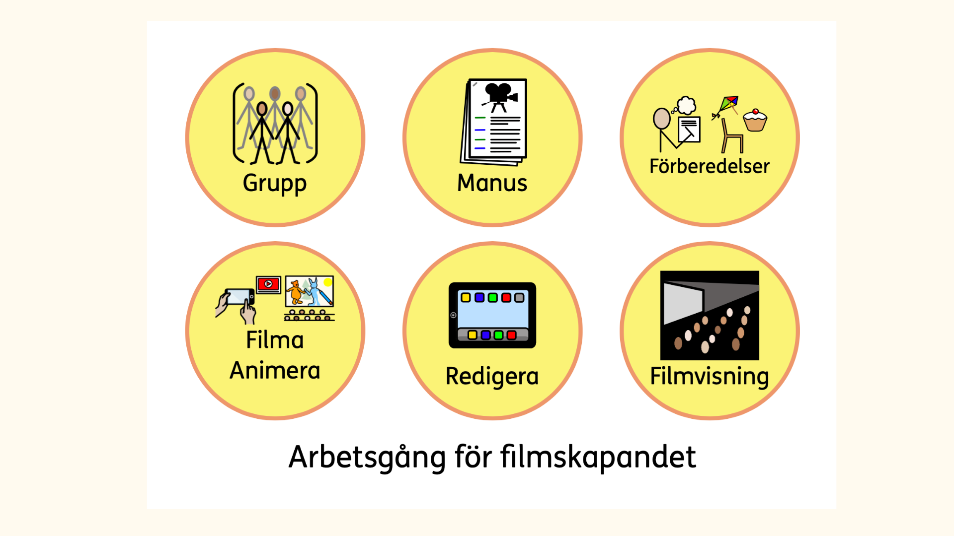 Symboler kan användas för att visuellt synliggöra vad som kommer ske under en filmworkshop. Att kunna följa en arbetsordning och på andra sätt få struktur i lärandet. Symbolstöd i form av scheman och arbetsordningar bidrar till ökad självständighet och skapar trygghet för personer i behov av extra stöd.